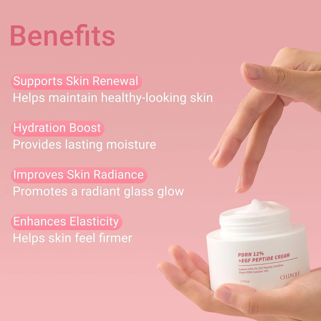 CELDYQUE PDRN 12% + EGF Peptide Face Cream is an advanced Korean moisturising cream designed to support skin hydration, firmness, and visible smoothness. Formulated with PDRN, EGF Peptide, and skin-conditioning ingredients, this nourishing cream helps improve the appearance of fine lines and uneven texture while enhancing overall radiance.